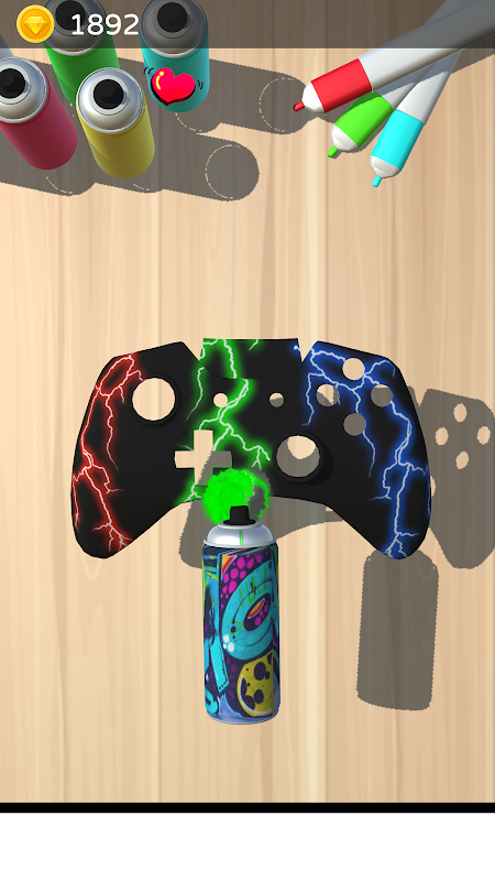 Esta é uma simulação criativa de jogo para criar consoles personalizados. Inclui estêncil, tinta spray, verniz e canetas hidrográficas coloridas.