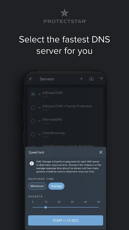 • Teste de velocidade de DNS avançado para encontrar automaticamente o servidor mais rápido disponível.