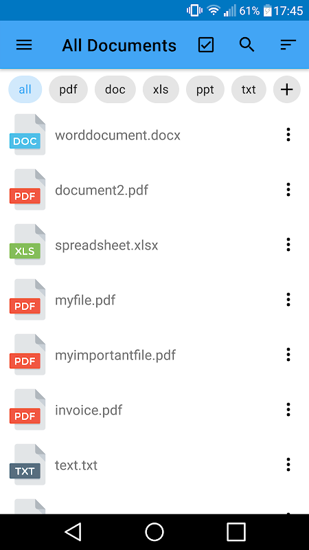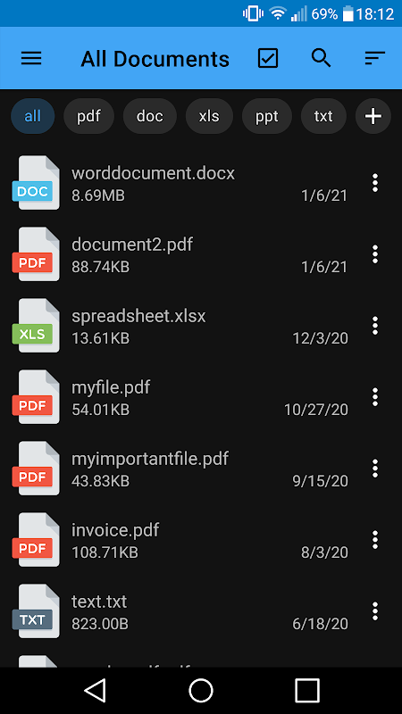 O Document Manager permite adicionar filtros de extensão de arquivo personalizados, que permitem estender infinitamente a funcionalidade do aplicativo. Basta adicionar a extensão no menu de configurações e a partir de agora o Document Manager mostrará todos os seus arquivos dessa extensão. Nem precisam ser documentos! Trabalhando com tipos de arquivo incomuns? Você não precisa mais vasculhar pastas em seu dispositivo para encontrá-los! AVISO: Você pode precisar de outros aplicativos especializados se planeja abri-los/editá-los.