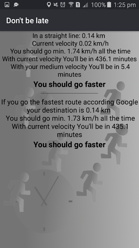 Application get your destination address,current location(GPS),destination time and HELP You don't be late.