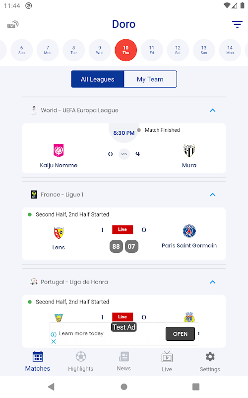 - Live broadcast of the matches from its official sources