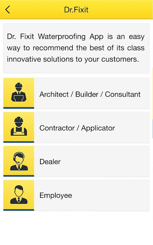 Dr. Fixit Waterproofing App is an easy way to recommend the best of its class innovative solutions to your customers. WE have tailor-made the information to give you a quick reference of waterproofing just a click away. Versatile app catering to various scale of contructionranging from Bunglows, Multi-storey and commercial buildings – simple waterproofing practices to elaborate complex structures waterproofing recommendations. A complete waterproofing guide for Architects, Builders, Consultants, Contractors, Engineers, and Applicators. Let the Waterproofing Expert take you through the latest Waterproofing techniques for Basement, Podiums, Wet Areas, Roofs, Exterior and Interior Walls.