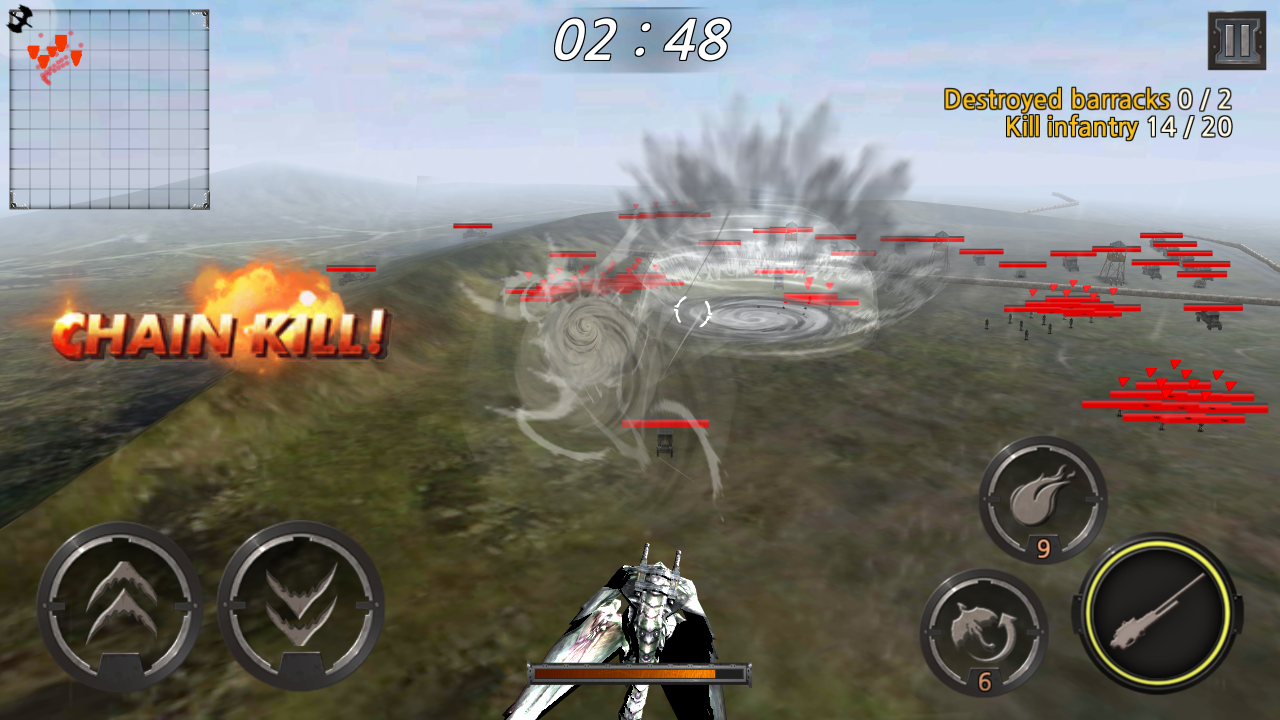 드래곤 스톤을 통해 능력치를 강화하여 드래곤에게 대항하기 위해 개조, 개발되는 신무기들을 파괴하며 적군의 포화를 뚫고 미션을 완수하라!