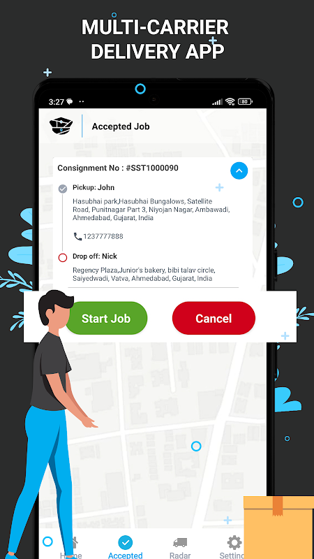 O administrador da empresa pode criar uma vaga no aplicativo do motorista, aqui o motorista pode aceitar ou recusar a retirada do pedido. Após os motoristas aceitarem o trabalho, eles poderão ver as informações do pedido (nome, telefone, endereço e dados de entrega).