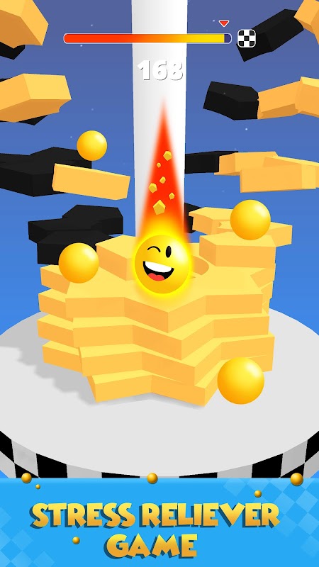 Press and hold on the screen to let the ball fall down so that the ball doesn't touch the black stacks! Hold for as long as possible to break all blocks and overcome the obstacles, through revolving helix platforms to reach the end 👌