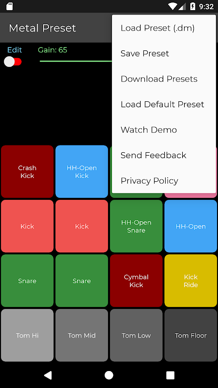 Tocar bateria como um profissional. Você pode adicionar vários sons ao mesmo bloco. Não há necessidade de usar vários dedos. Você pode editar e baixar predefinições.