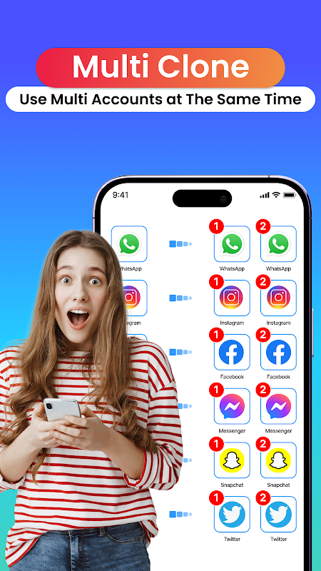O aplicativo de clonagem de várias contas de espaço duplo tem uma função de appclone, leva vários aplicativos sociais e via clonador de aplicativo gratuito, ou seja, um super cloner, jogos de clone e aplicativo de clone. O espaço duplo gratuito contém armazenamento de espaço extra e mais para manter e executar várias contas em paralelo.