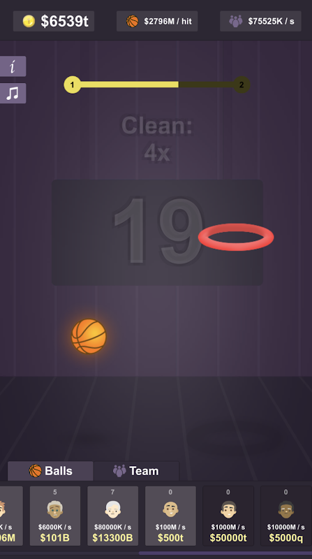 Shoot hoops to earn coins, buy and upgrade balls to earn more per each hit, hire team to make passive income. Gain score to achieve new levels. Every clean dunk multiplies your hit score. Each level up multiplies your balance.