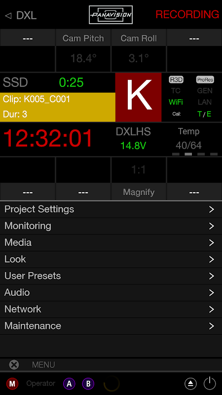 O Controle DXL oferece ao usuário total controle de menu e recursos de uma câmera Panavision Millennium DXL quando conectado à rede Wi-Fi da câmera.