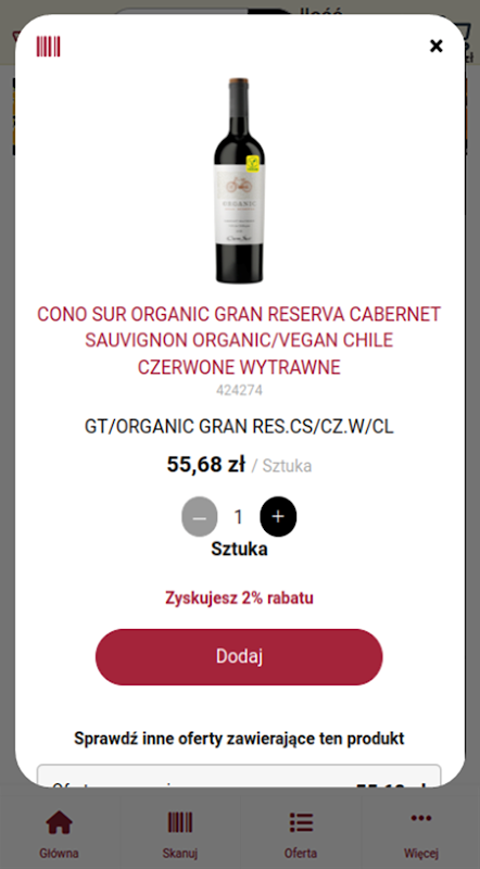 Esta é a forma mais fácil de realizar compras, na plataforma criada pela TiM S.A. - um distribuidor líder de vinho na Polónia. Agora adicionar produtos é brincadeira de criança. Basta escanear o código EAN disponível no produto e o produto selecionado será adicionado automaticamente ao carrinho de compras.