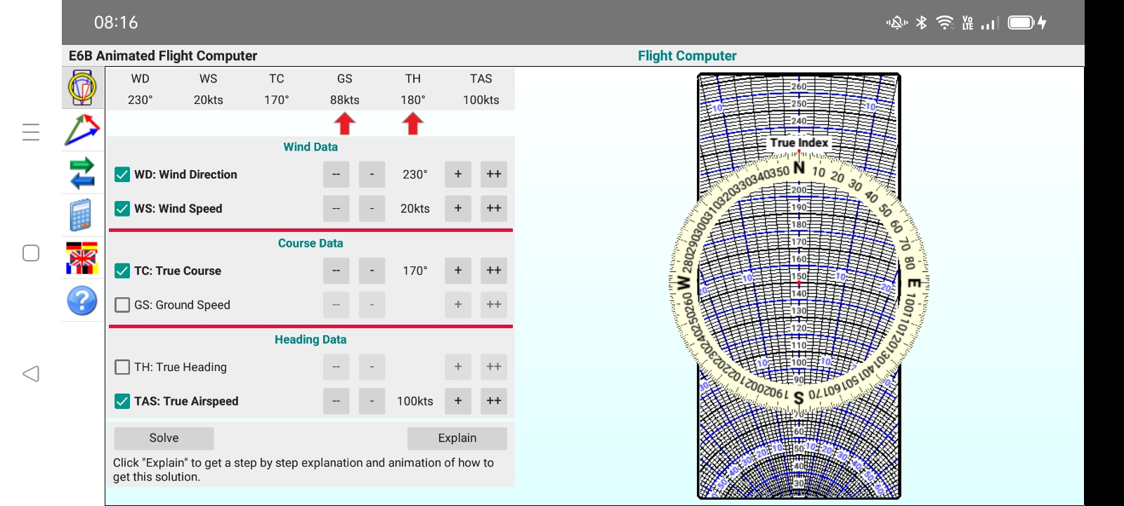 Este aplicativo resolve um triângulo de vento permitindo que você insira quatro valores dentre seis (três velocidades e três ângulos) e calculando os dois restantes. Em seguida, explica passo a passo como chegar a uma solução usando um computador de voo animado que mostra como executar cada etapa: a animação gira o disco, desliza-o e adiciona marcas. Também mostra qual dos valores fornecidos deve ser usado em cada etapa para chegar à solução.