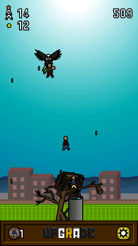 Fire people away and try to hit the eagle to keep him away from his nest. Don't miss. Use your coins wisely in the upgrade section, this is necessary while the game advances.