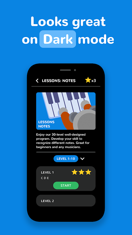 Desfrute do nosso programa bem projetado de 30 níveis. Desenvolva sua habilidade para reconhecer notas diferentes. Ótimo para iniciantes e músicos.