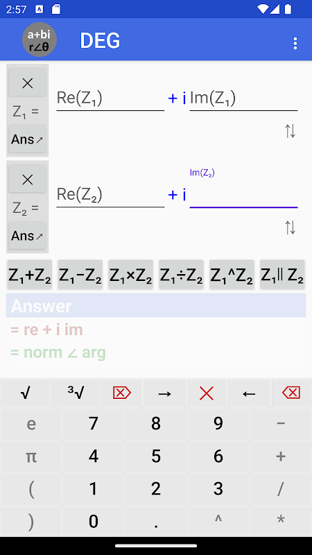 Esta calculadora de números complexos permite que as partes de um número complexo sejam inseridas como uma expressão como 1/2 + 2(3+4)^3 - 4√(5) + 2π/6.