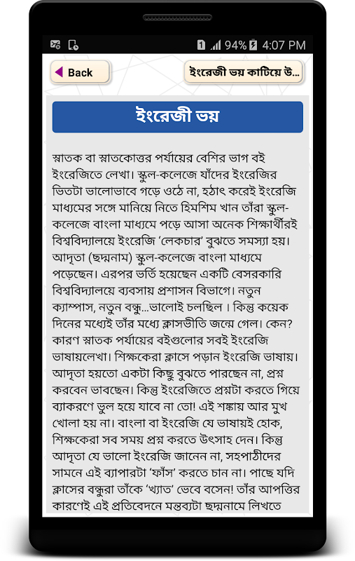 এই অ্যাপটি মূলোত সহজে ইংরেজি শেখার বই, যেখানে আপনি ধাপে ধাপে সহজ ফর্মূলায় ইংরেজি শিখতে পারবেন। এই অ্যাপটিতে রয়েছে সহজ ইংরেজি গ্রামার, প্রয়োজনীয় ইংরেজি শব্দের অর্থ, ইংরেজি অনুবাদ, ইংরেজি বানান শিক্ষা আরও ইংরেজি শিখার নানা টিপস। এই অ্যাপটি আপনারা অফলাইনেও ব্যবহার করতে পারবেন। আশাকরি আপনার ইংরেজি শেখার ক্ষেত্রে অ্যাপটি গুরুত্তপূর্ণ ভুমিকা পালন করবে।