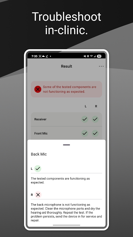 O Easy Line™ Pro permite que profissionais de saúde auditiva realizem diagnósticos em aparelhos auditivos e solucionem problemas instantaneamente, abrangendo receptores, microfones frontais e traseiros, circuitos e baterias.