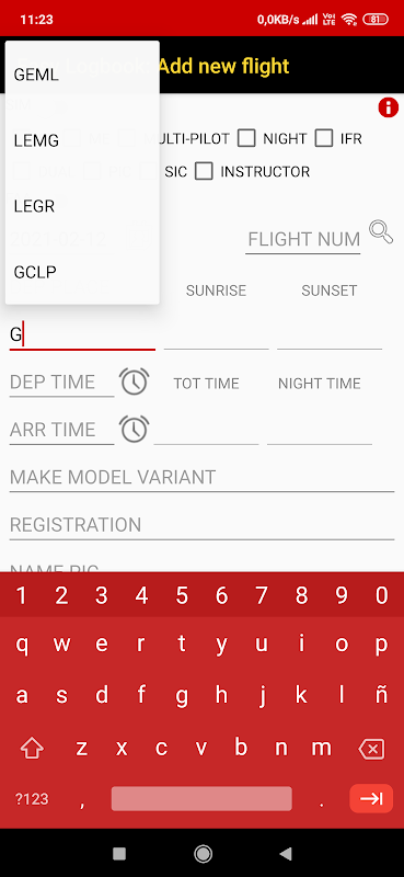 Ao inserir o dia do calendário e o aeroporto de destino serão exibidos os horários do nascer e do pôr do sol. O Easy Logbook calculará o tempo do voo noturno com base nos horários de partida e chegada. Você também pode ajustar o valor manualmente.