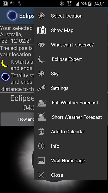 O aplicativo informa sobre os horários exatos do eclipse com base em seu GPS individual ou posição de rede. Ele mostrará um mapa com todo o caminho do eclipse, fornecendo detalhes sobre os horários e as circunstâncias locais. Mesmo antes do eclipse, você pode ver uma animação do evento como será visto de sua localização. Quando o eclipse estiver em andamento, ele mostrará uma animação em tempo real do evento celestial. Você ouvirá anúncios acústicos de estágios importantes do eclipse e verá uma contagem regressiva em seu visor. Pesquise sua localização favorita em um enorme banco de dados ou no mapa ou simplesmente use a posição real do dispositivo.
