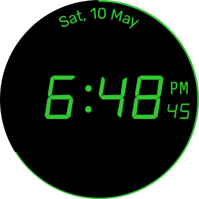 Mostrador digital minimalista para Wear OS com interface escura, fonte de sete segmentos e indicador circular de bateria.