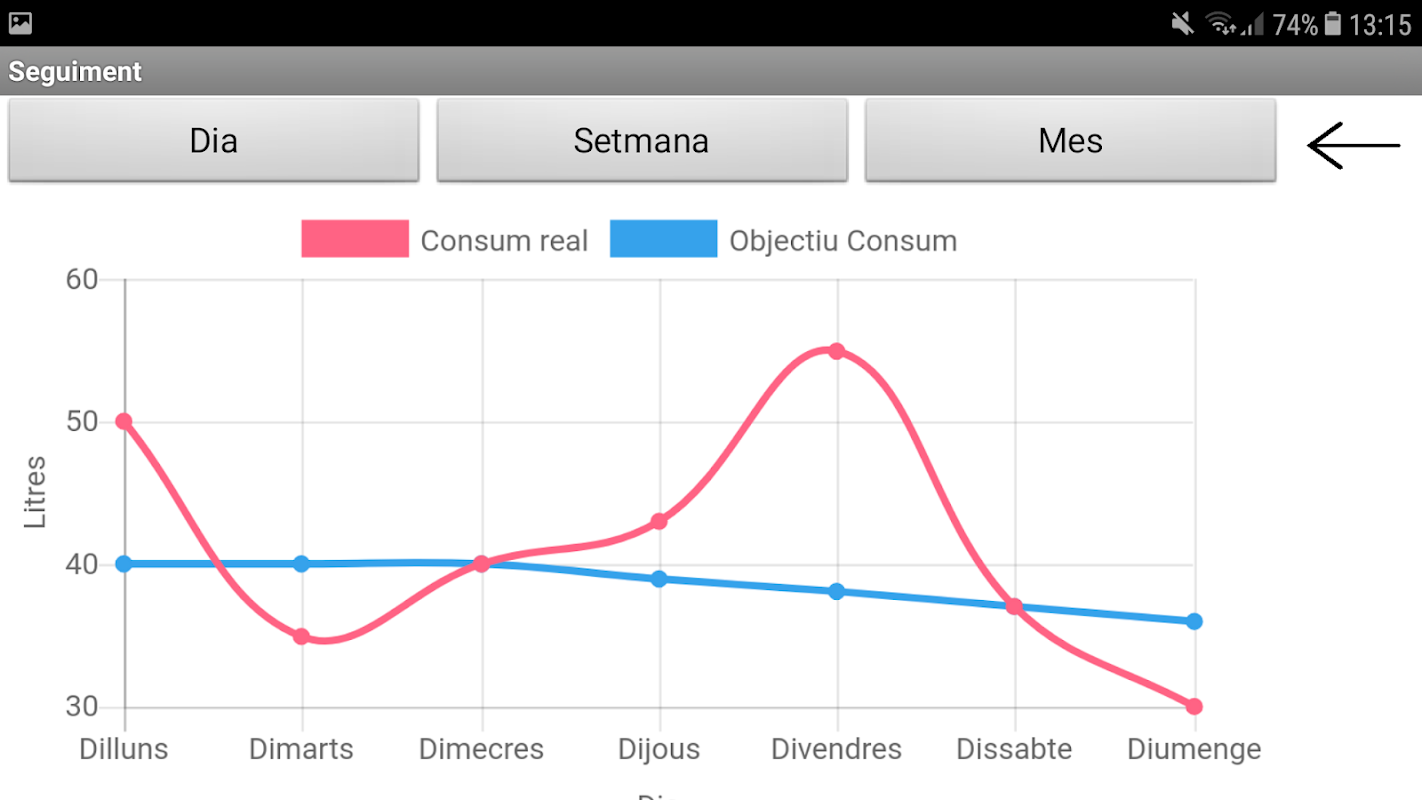 · Per a obtenir una informació més detallada hem incorporat uns gràfics que indiquen el que gastes per dia, per setmana i per mes.