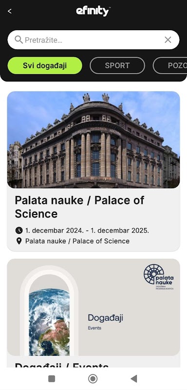 eFinity – O primeiro aplicativo integrador na Sérvia que oferece aos usuários uma maneira simples e rápida de comprar ingressos para shows, festivais, teatros, eventos esportivos e todos os outros eventos, além de muitos serviços e benefícios adicionais.
