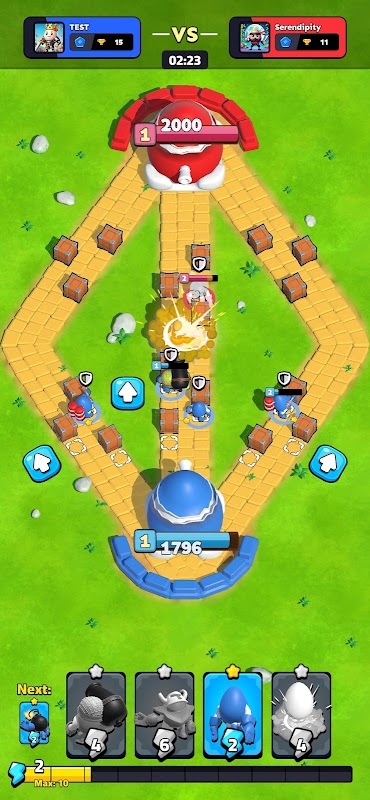 As tropas são convocadas primeiro na defesa, mas cabe a você decidir o momento perfeito para lançar um ataque e oprimir seu oponente. O objetivo final é destruir a base inimiga usando habilmente suas pistas de ataque para surpreender seu inimigo. Mas tenha cuidado - às vezes a defesa será sua melhor opção e, outras vezes, você precisará partir para a ofensiva! Cada partida é um desafio estratégico onde cada movimento pode ser decisivo.