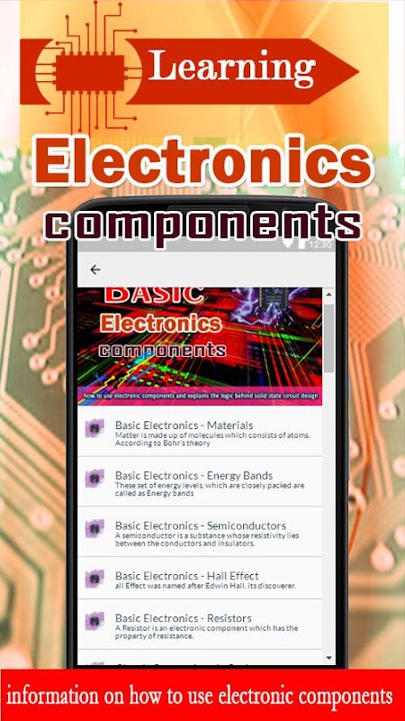 Este aplicativo fornece informações básicas sobre como usar os componentes electrónicos e explica a lógica por trás desenho do circuito de estado sólido. Começando com uma introdução à física de semicondutores, o tutorial se move para cobrir tópicos tais como resistores, capacitores, indutores, transformadores, diodos e transistores.