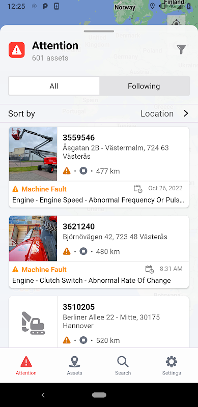 O ELEVATE Go visa melhorar a eficiência e o tempo de atividade do equipamento - no local e fora do local. Acompanhe seu equipamento com os clusters de mapas intuitivos e veja exatamente quais ativos estão funcionando, se movendo ou parados no momento. A lista Atenção classifica as máquinas que precisam de atenção por gravidade, permitindo que o técnico priorize seu foco. Quando máquinas específicas precisam de observação extra, você pode até acompanhar e receber notificações push sobre todos os eventos relacionados à máquina.