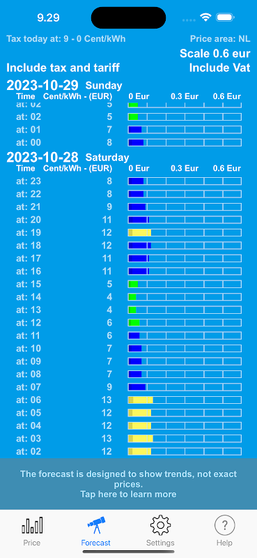 Neste aplicativo você pode verificar os preços spot de energia elétrica para as próximas 24 horas, preços históricos e uma previsão para os próximos dias. Os preços futuros são exibidos assim que estiverem disponíveis, com atualizações à tarde para o dia seguinte. Você pode optar por visualizar os preços com impostos, tarifas e IVA. Você também pode inserir seus acréscimos pessoais ao preço à vista, preços fixos e taxas e tarifas de eletricidade.