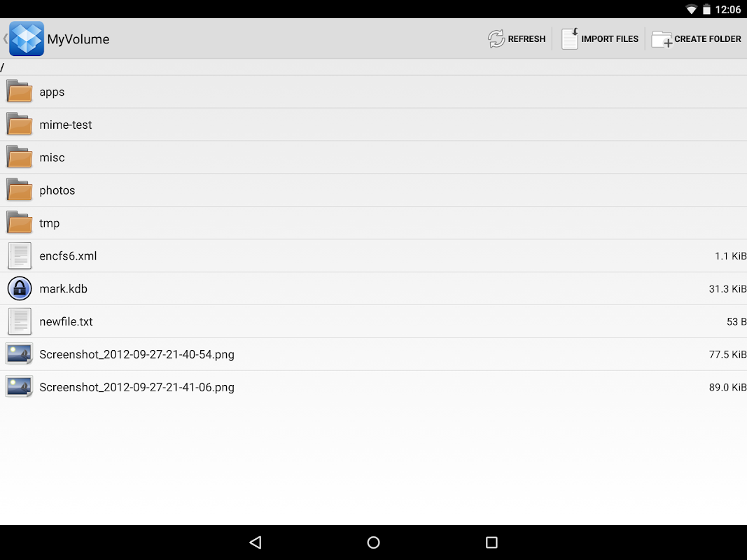 Encdroid is a file manager application for Android devices to keep your files encrypted on Dropbox, Google Drive or the local storage of the device. It is compatible with EncFS so volumes created with Encdroid can be accessed on Windows/MacOS/Linux desktop and laptops and vice versa.