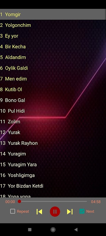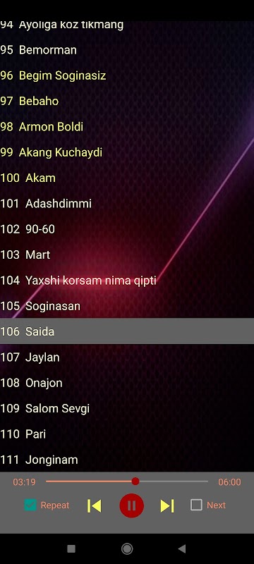 Hammasi bo'lib 111 ta qo'shiq mavjud, butunlay oflayn.