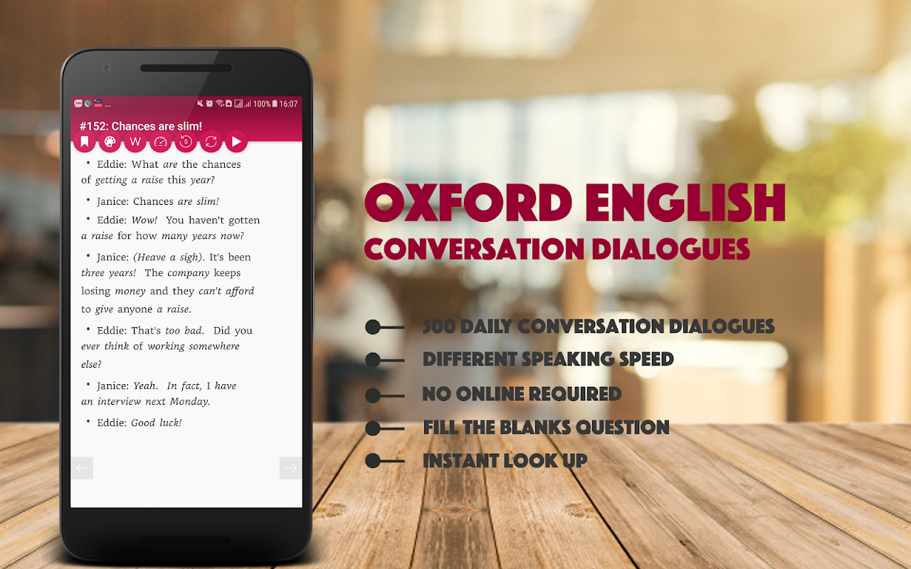 Aprenda a falar inglês através de centenas de diálogos de conversas da vida real é a maneira mais eficaz de aprender inglês. Enfatize a escuta, o aplicativo ajuda você a melhorar sua habilidade de escuta, pronúncia, saber perguntar e responder na conversa diária.