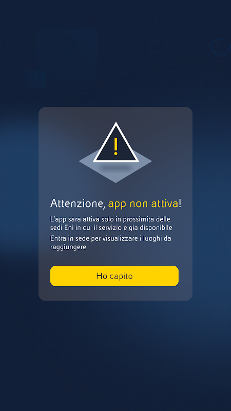 A app apresenta um menu de pontos de pesquisa que podem ser identificados dentro de um edifício Eni (escritórios abrangidos pelo serviço: escritório na via Milano)