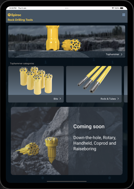 Descubra a melhor experiência de catálogo com nosso aplicativo Epiroc Rock Drilling Tools