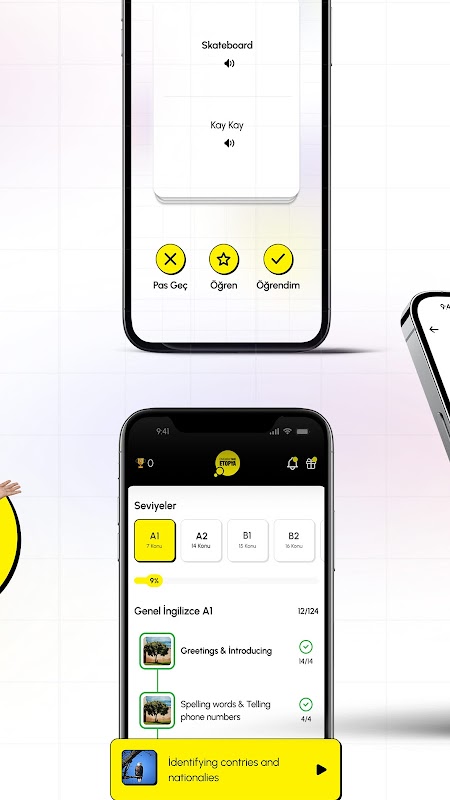 Aprendizagem de línguas interativa, divertida e permanente para usuários com diferentes tipos de perguntas e exercícios visuais