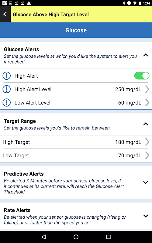 Além do valor atual da glicose, o Eversense Mobile App fornece alertas para hipo e hiperglicemia com base nas configurações que você inserir. Ele também exibe a taxa e a direção das alterações de glicose e fornece a capacidade de inserir eventos relacionados à glicose, como refeições, insulina e exercícios. O aplicativo móvel Eversense CGM também é compatível com o aplicativo móvel Eversense NOW Remote Monitoring.