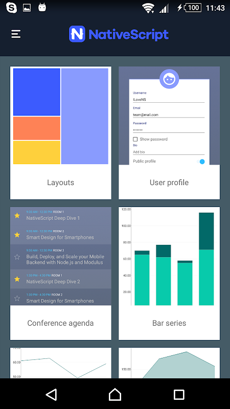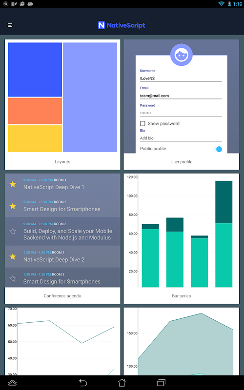 O aplicativo demonstra a funcionalidade de NativeScript.