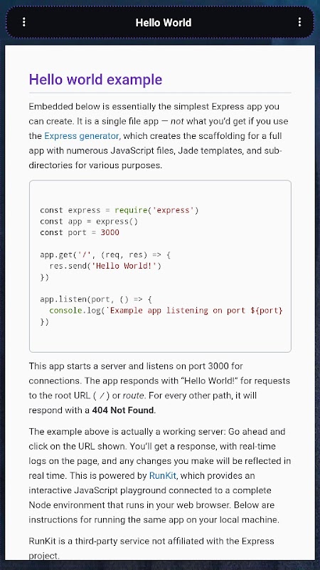 Express.js é a estrutura NodeJS mais popular. Este aplicativo permite que você aprenda completamente offline. Você também pode ativar outras estruturas e recursos de dentro do aplicativo.