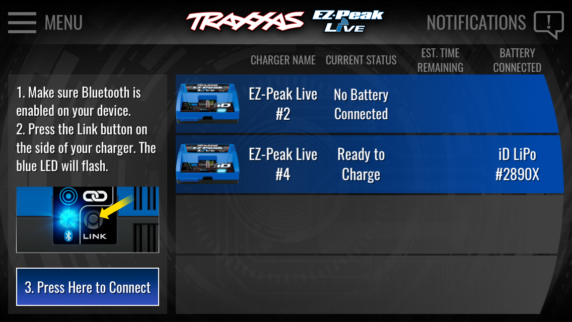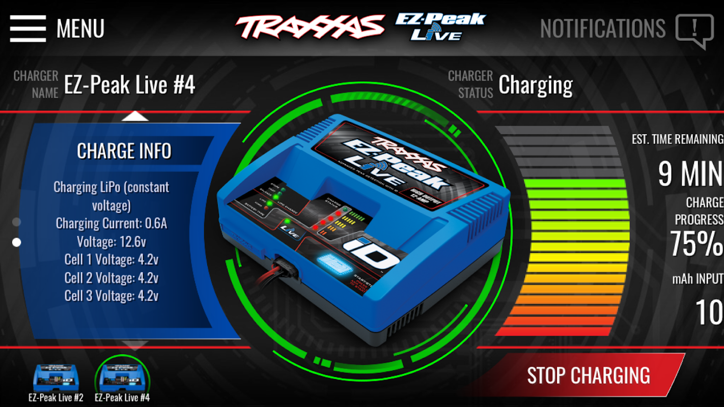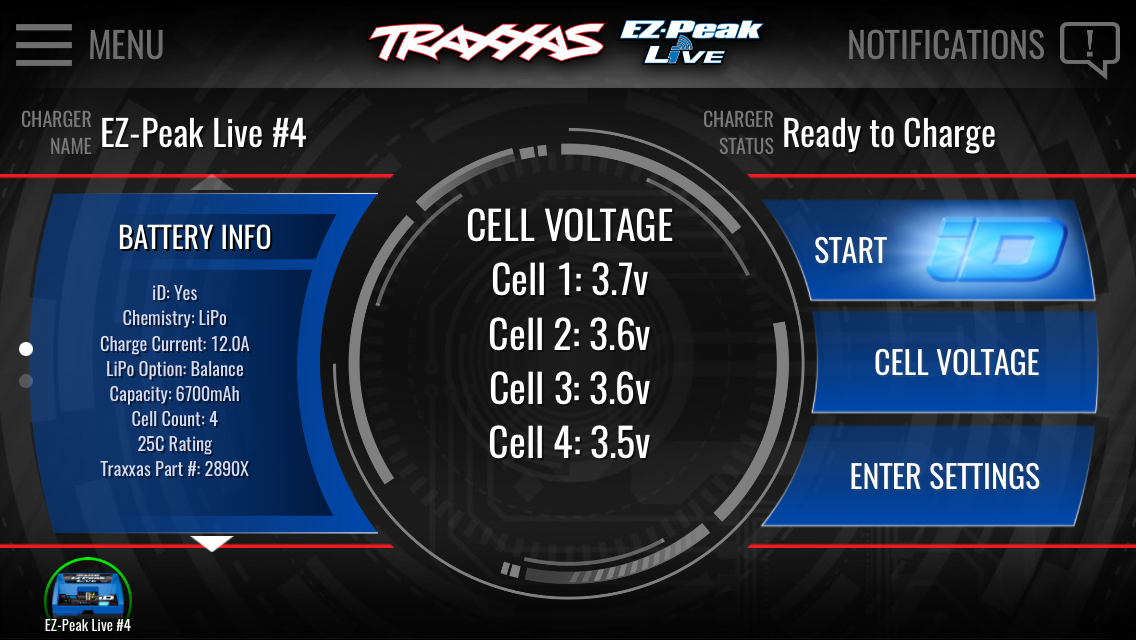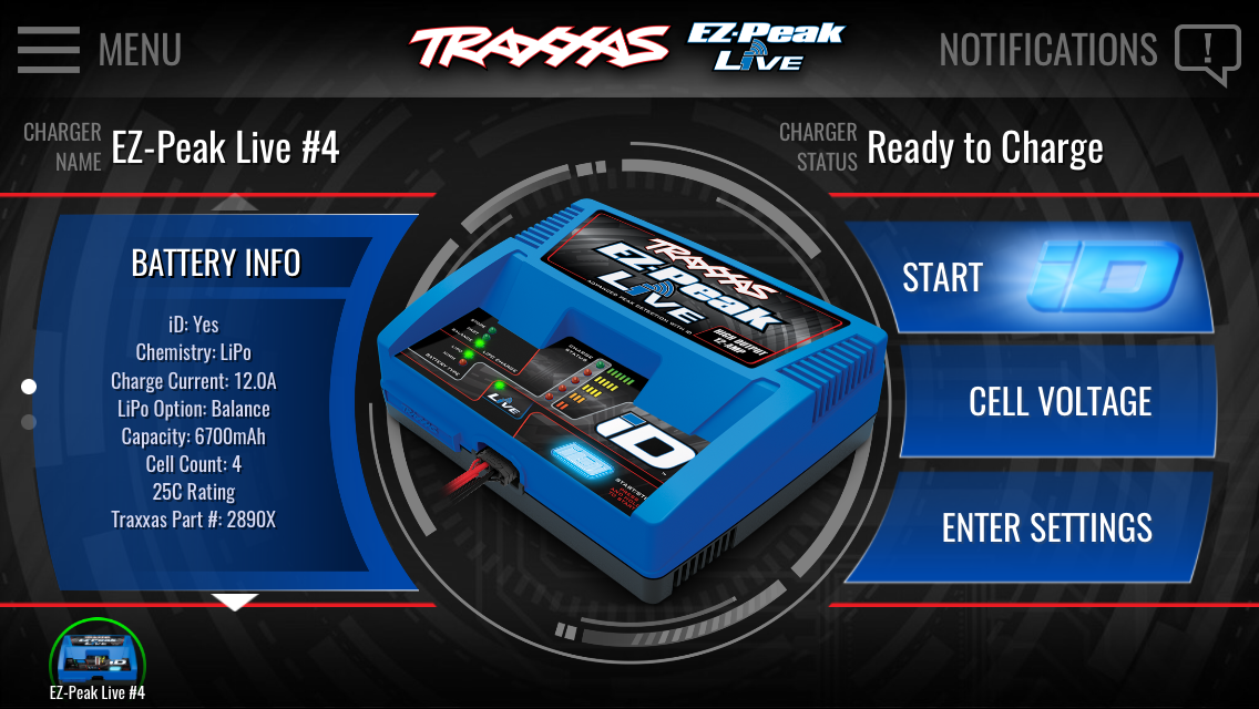O sistema Traxxas iD é a maneira mais fácil e mais eficiente para carregar as baterias equipado-ID. Quando você conecta uma bateria equipado-ID para o seu carregador ao vivo EZ-Peak, informações da bateria será automaticamente exibida na tela do aplicativo. O aplicativo permite que você verificar instantaneamente o status da sua bateria e tensões de células lipo individuais com leituras claras e precisas. Use configurações automáticas do carregador ou configurar o seu próprio com os controles deslizantes easy-to-use e botões na interface gráfica de alta definição.