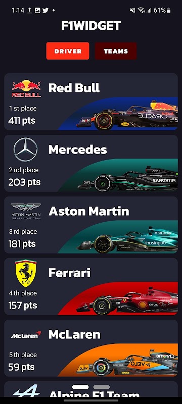 Neste aplicativo, você pode ver a classificação da F1 e todas as informações de cada piloto também pode usar um widget na tela principal para mantê-lo com as últimas notícias da corrida.