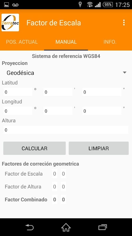 O aplicativo utiliza o GPS no seu smartphone e atual mostra coordenadas geodésicas (lat, long, h) e UTM (WGS84) com as seguintes correções geométricas: Correção escala elevação fator de correção e FACTOR COMBINADO, o último a ser introduzidas no estação total (coordenadas na estação de ponto).