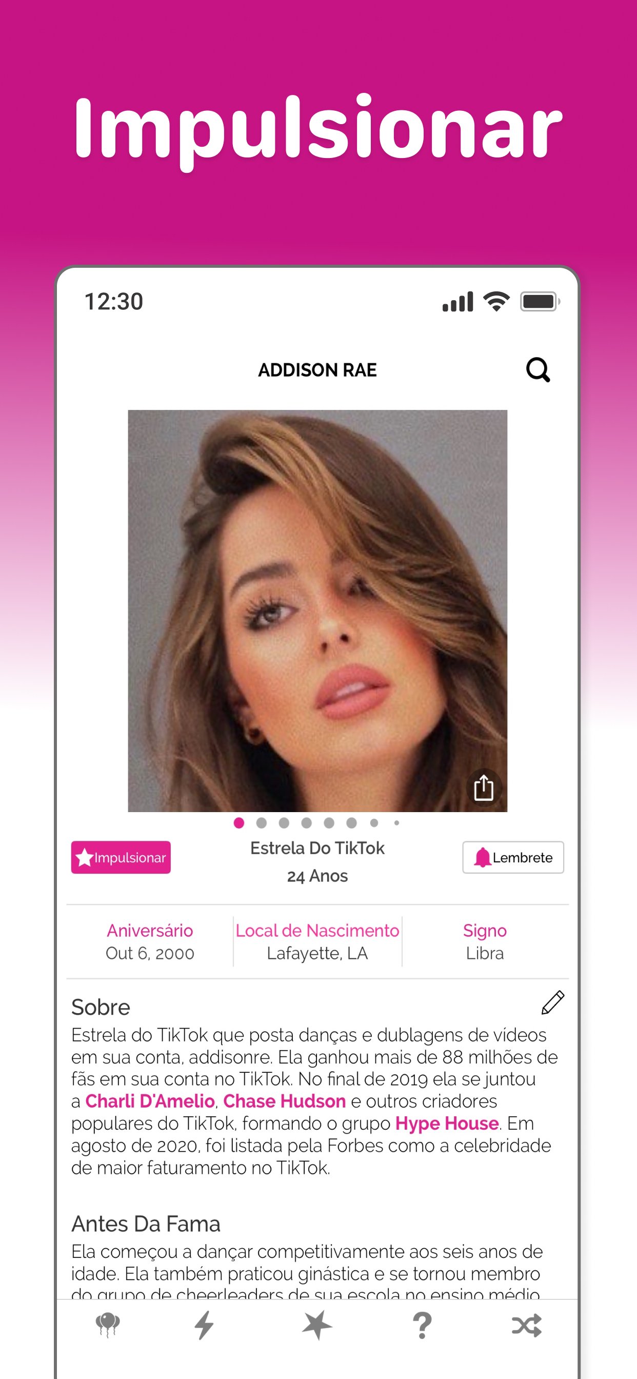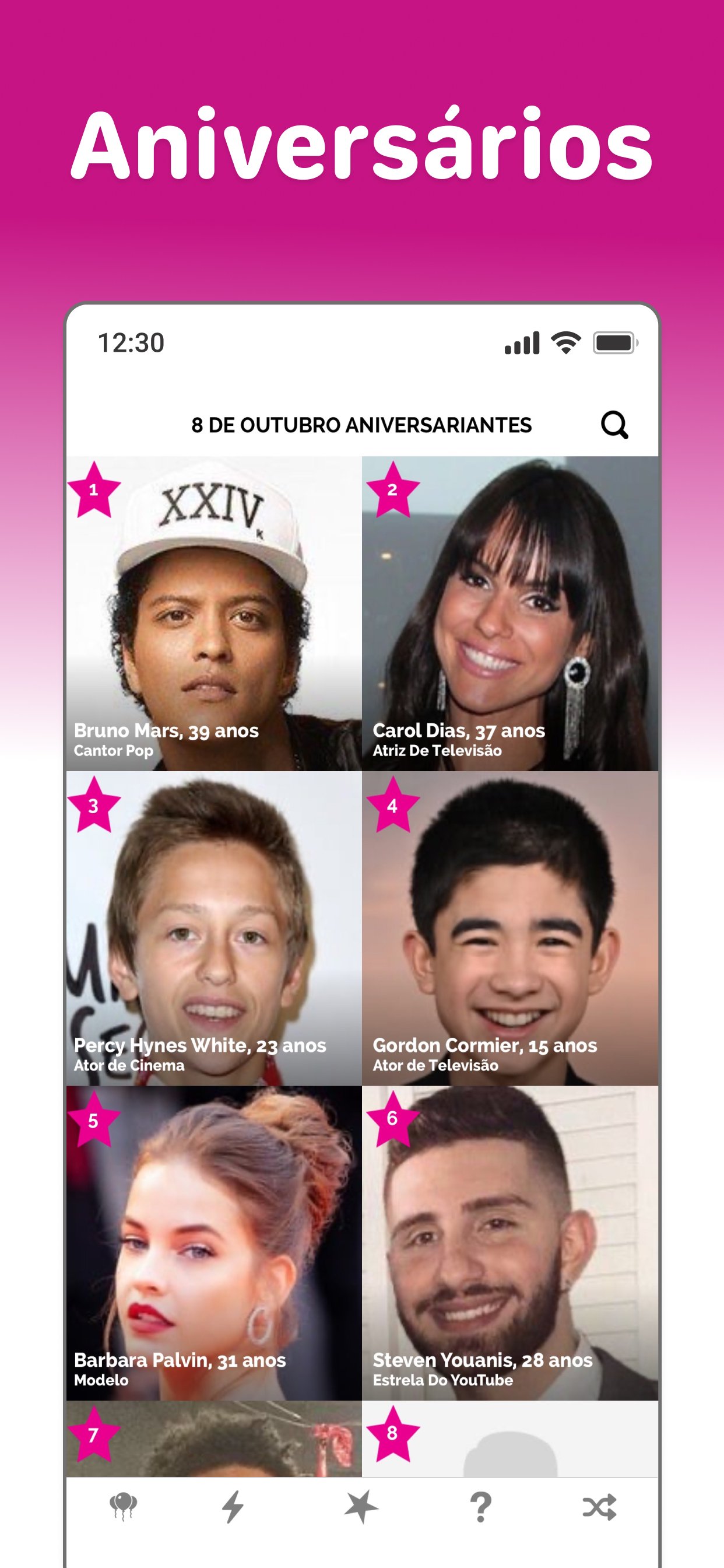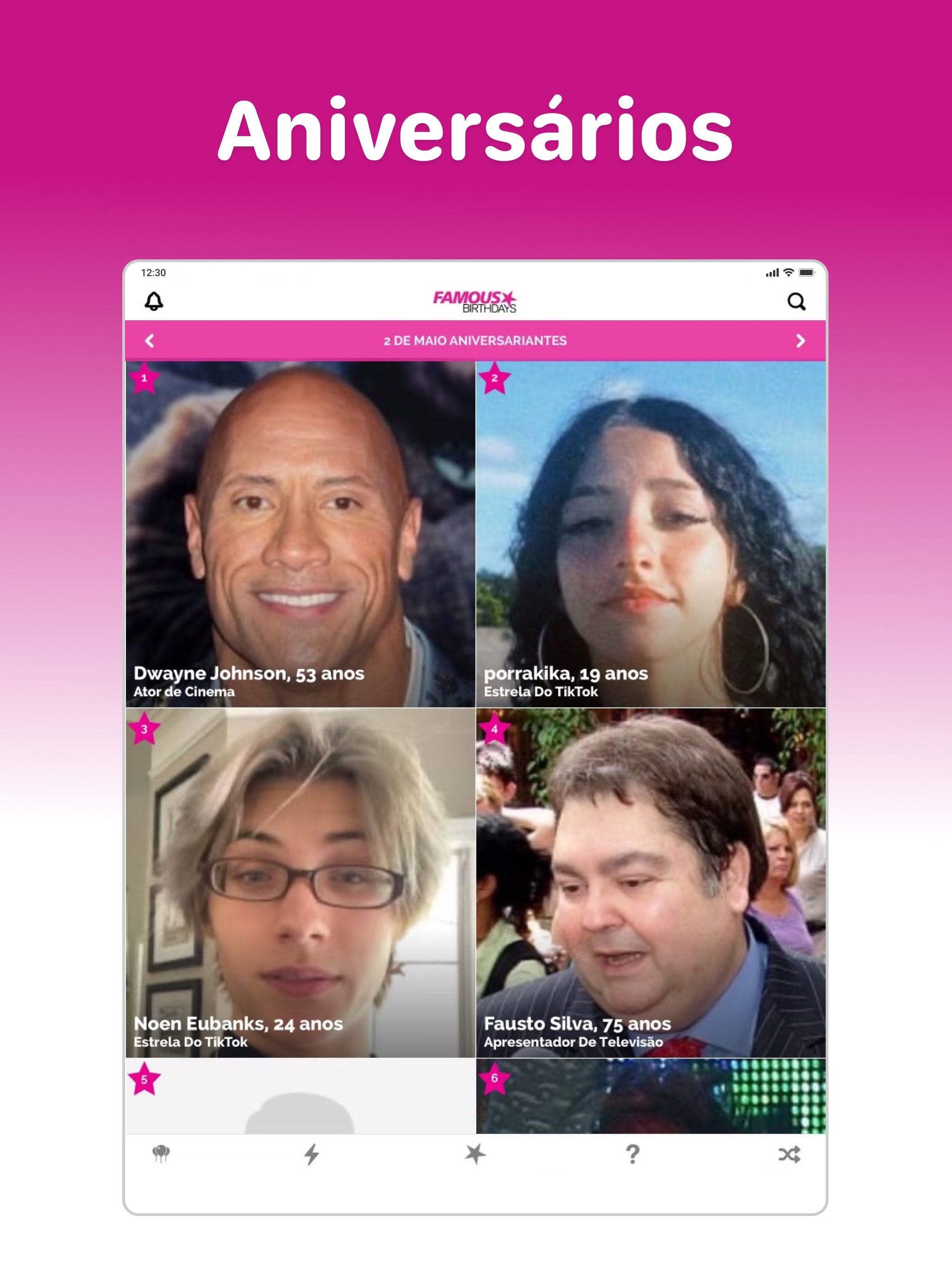 Famous Birthdays é o lugar definitivo para aprender sobre celebridades e criadores de conteúdo e impulsionar a popularidade dos seus favoritos. Comece cada dia conferindo os principais aniversários do dia e vendo quem está em alta, depois coloque seu conhecimento à prova com jogos de trívia cativantes.