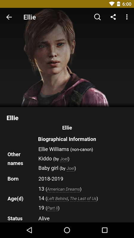 Fandom's app for The Last of Us - created by fans, for fans. Fandom apps are always up-to-date with highly accurate, real-time information from Fandom’s vast fan community. The Last of Us app features hundreds of pages of content created by fans just like you. Find in-depth articles on characters, weapons, locations, items, enemies, organizations, and much more. No other app offers this amount of accurate insights, tips and information with useful companion features such as: