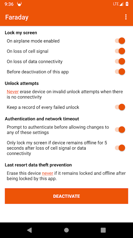 Faraday é capaz de bloquear automaticamente o dispositivo até que sua senha seja inserida quando certas condições forem satisfeitas, como após a perda do sinal da célula, conexão de dados ou quando o modo avião estiver ligado.