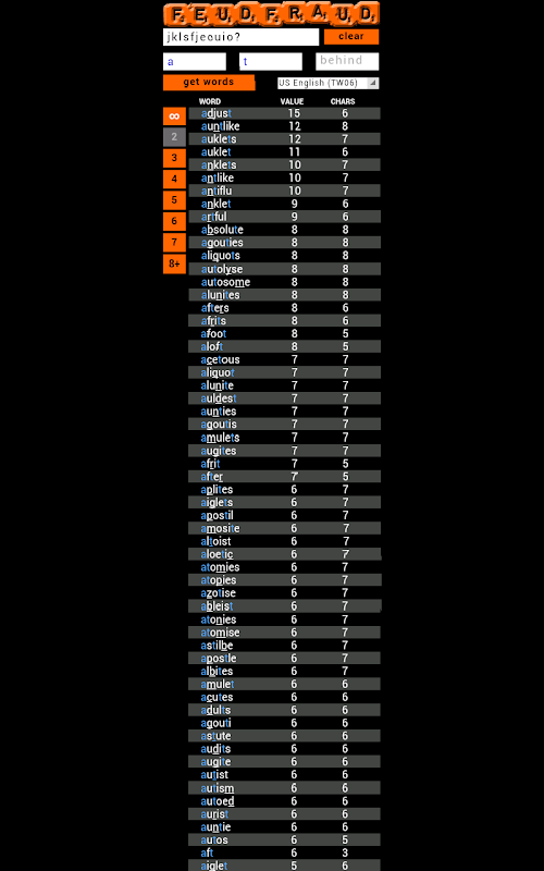 Quando você está sem inspiração ou quando recebe peças realmente ruins, o Feudfraud ajuda você a encontrar as palavras mais longas, inteligentes e valiosas em inglês do Reino Unido (SOWPODS), inglês dos EUA (TW06), holandês, sueco, norueguês, dinamarquês, francês, espanhol e alemão.