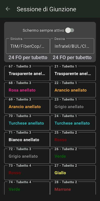 SESSÃO DE EMENDA: dadas as fibras iniciais dos dois cabos a serem emendados, mostra em tempo real a coloração a seguir para os cabos esquerdo e direito. Você pode manter a tela sempre ligada selecionando a opção apropriada.
