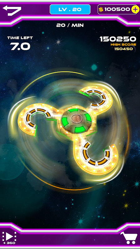 It has 6 very thoughtfully designed UFO like 3D Fidget Spinners, it has 3 Space Background, which you can buy with InApp Currency.