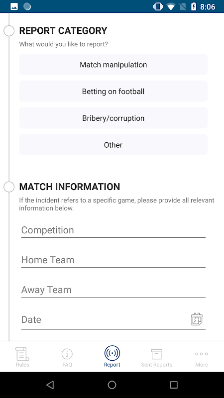 O aplicativo móvel foi projetado para fornecer um canal de comunicação confidencial e segura entre a FIFA eo usuário final. A principal funcionalidade do aplicativo é uma forma simples, que deve ser concluído por essas equipes, jogadores e árbitros com relativo às informações sobre apostas fraude associada, viciação de resultados ou violações às regras que afectam a integridade do futebol. Provas podem ser apresentadas utilizando os recursos de áudio e câmera de apoio a uma investigação. Equipes, jogadores e árbitros pode encontrar o Código Disciplinar da FIFA e do Código de Ética aqui FIFA para garantir que eles entendem as regras e também ter acesso ao feed de notícias FIFA, bem como alguns FAQs úteis a respeito do próprio app.