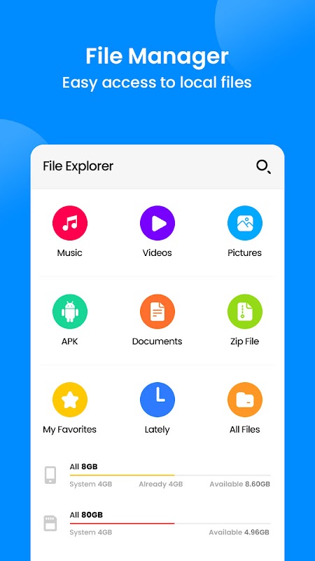 Os smartphones geralmente parecem um grande mistério, mas não mais! O Gerenciador de Arquivos Competentetem várias versões. Uma interface de usuário simples oferece suporte a todas as funções relacionadas a arquivos para cada formato. O gerenciamento de arquivos nunca foi tão fácil. Existem vários tipos de arquivos, como arquivos de mídia e apk. De relance, você sabe quais arquivos residem onde no telefone.