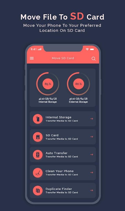 Este aplicativo Arquivos para cartão SD é usado para mover, copiar ou fazer backup de arquivos da memória interna para o cartão SD do seu telefone. Com este programa, você pode liberar com um clique a memória interna do dispositivo ou fazer backup de seus arquivos no cartão SD.